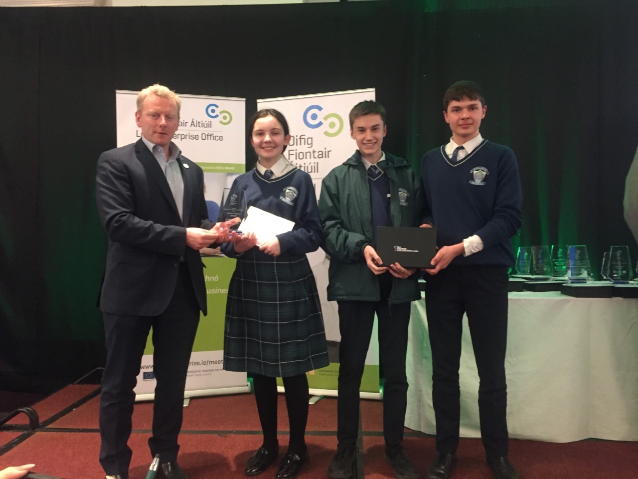 Coláiste na Mí was well represented at the Meath County Enterprise Awards with another highly sought after business “One Touch Solutions” by Conor and Diarmuid.  Again their product was developed by 3D printing specially designed IPad stands and a product called Safe wire – designed to prevent phone charger wires breaking.